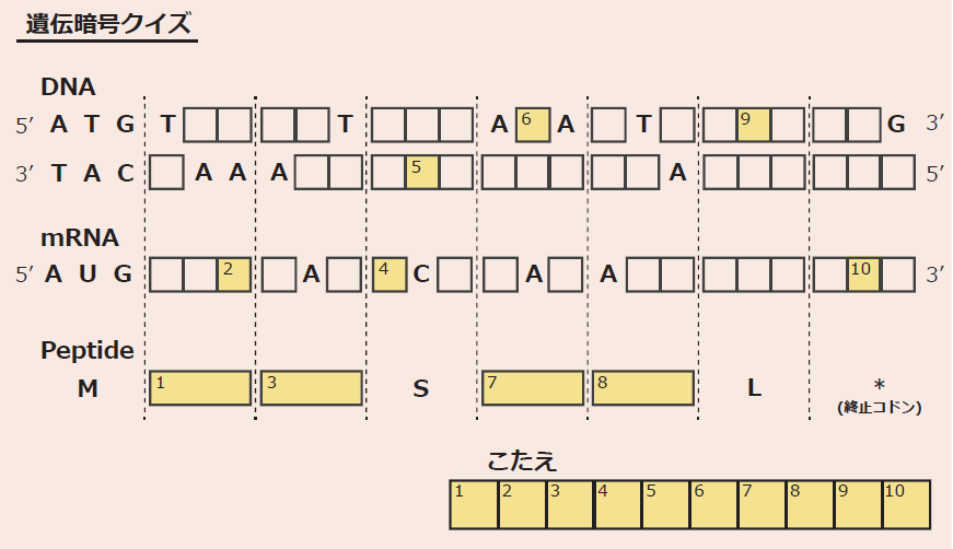 遺伝暗号を解読してマスを埋め、黄色のマスのアルファベットをこたえの該当する数字のマスに入れてださい。